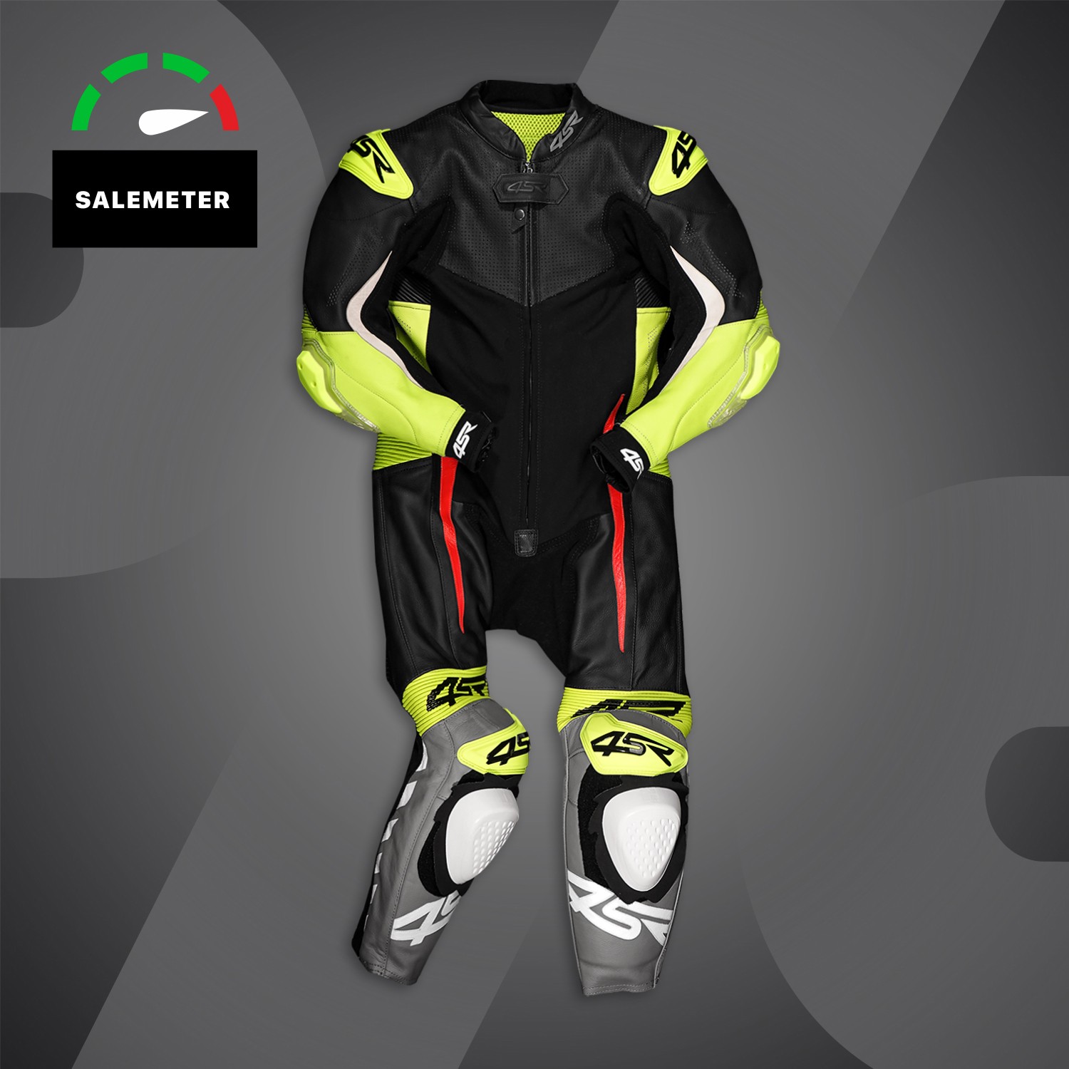 Het racepak is uitgerust met Elbow Down TECH - elleboog sliders. Deze zijn verkrijgbaar in verschillende kleuren - zwart, rood, fluorescerend rood, fluorescerend geel en groen. De prijs van dit racepak is inclusief 1 paar fluo gele sliders, je kunt ze ook kopen.