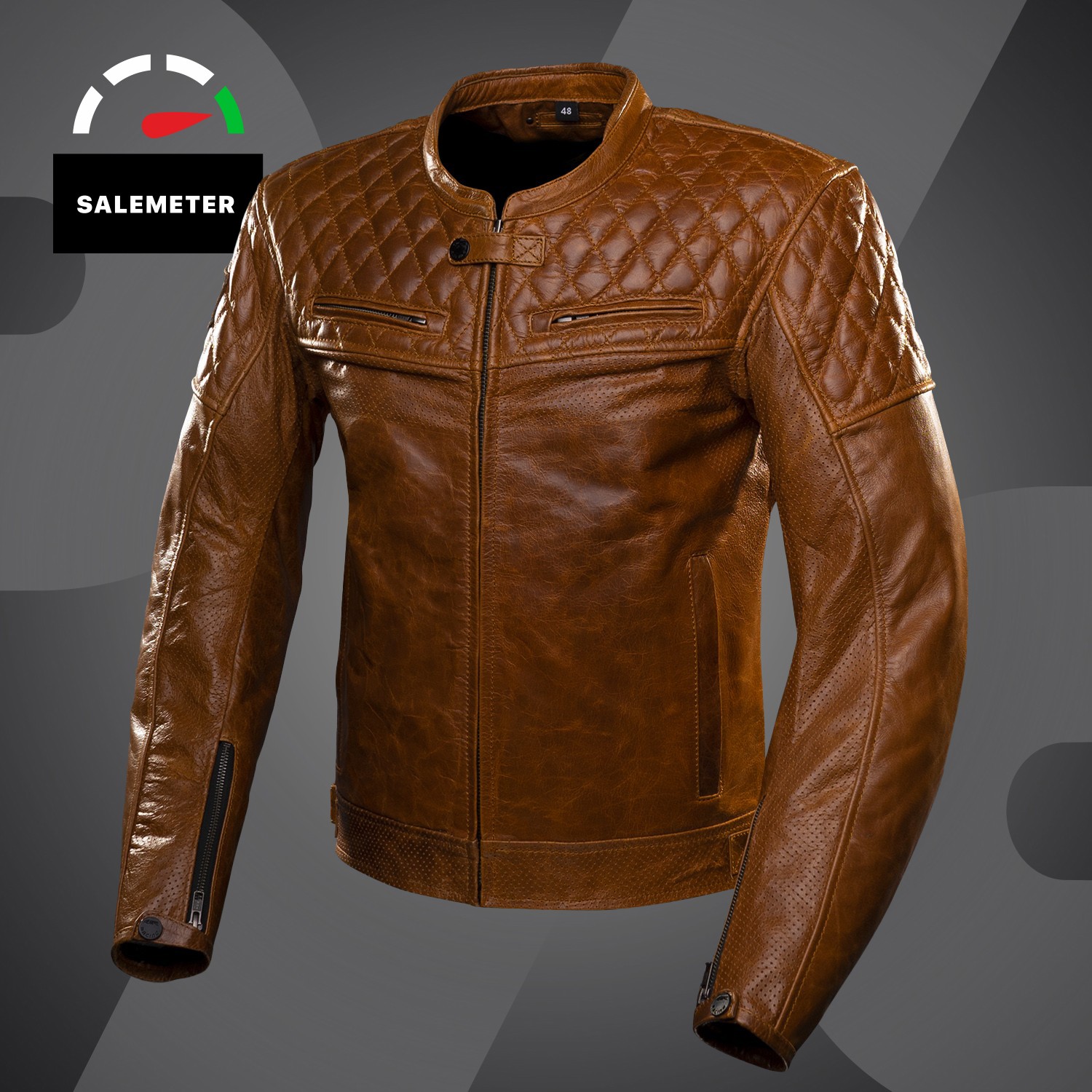 Een luxe en stijlvolle motorjas gemaakt van premium buffelleer, dat een sprankelende bruine kleur heeft, zoals de beste cognacs.